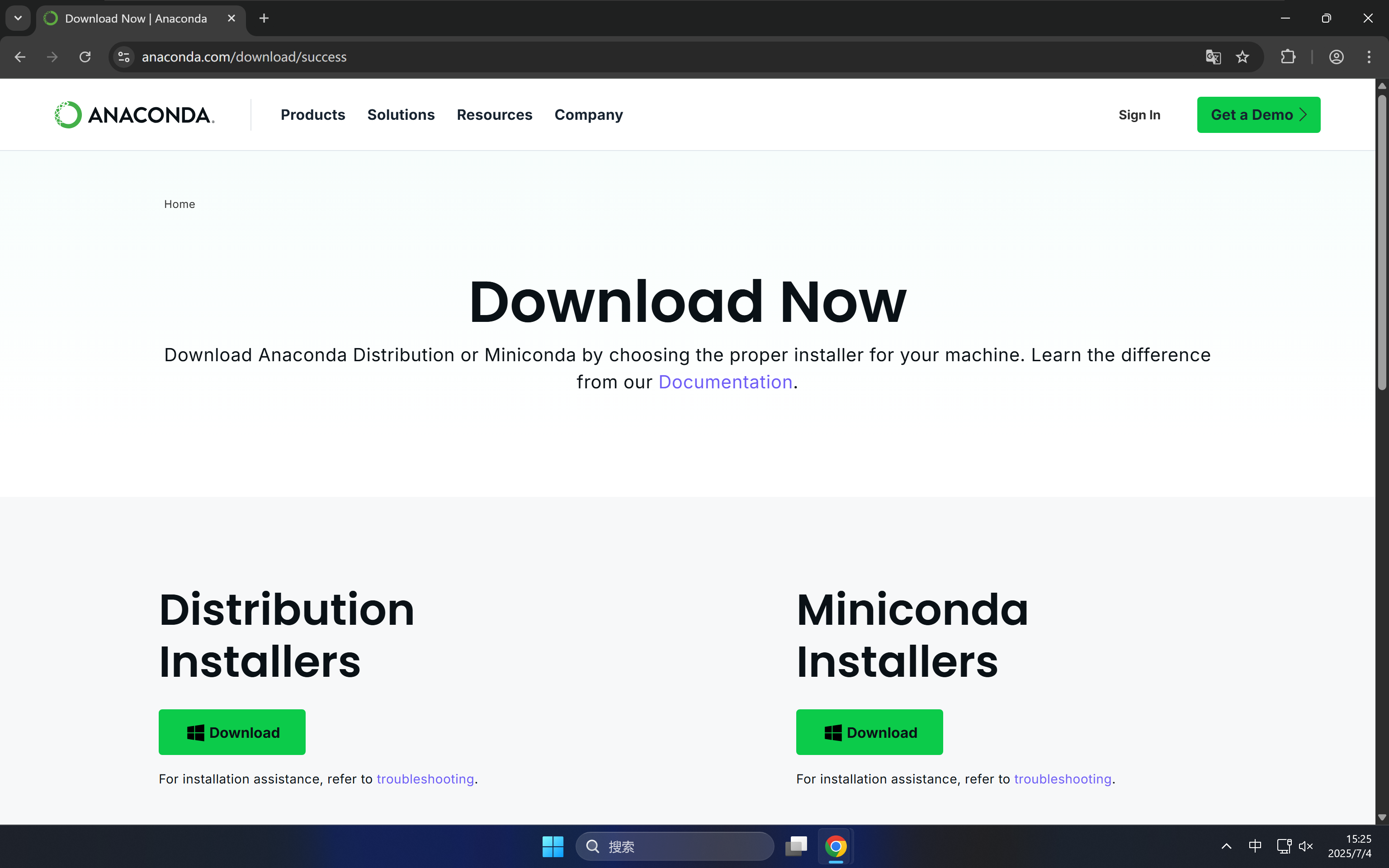 访问Anaconda官方网站,点击左下角Distribution Installers下的Download按钮,即可下载安装包(下载慢怎么办?挂VPN,小白不建议从清华源下,版本太多。没有VPN?看这个)。