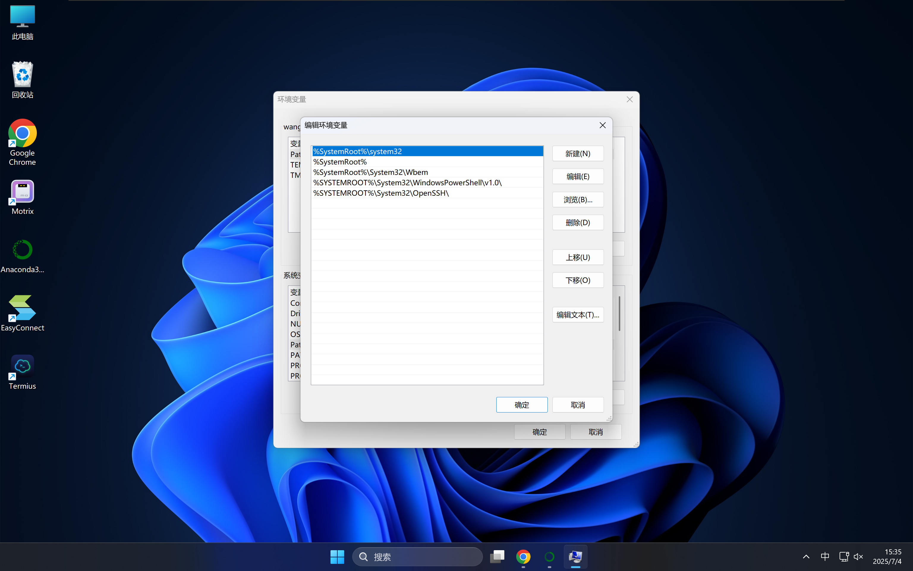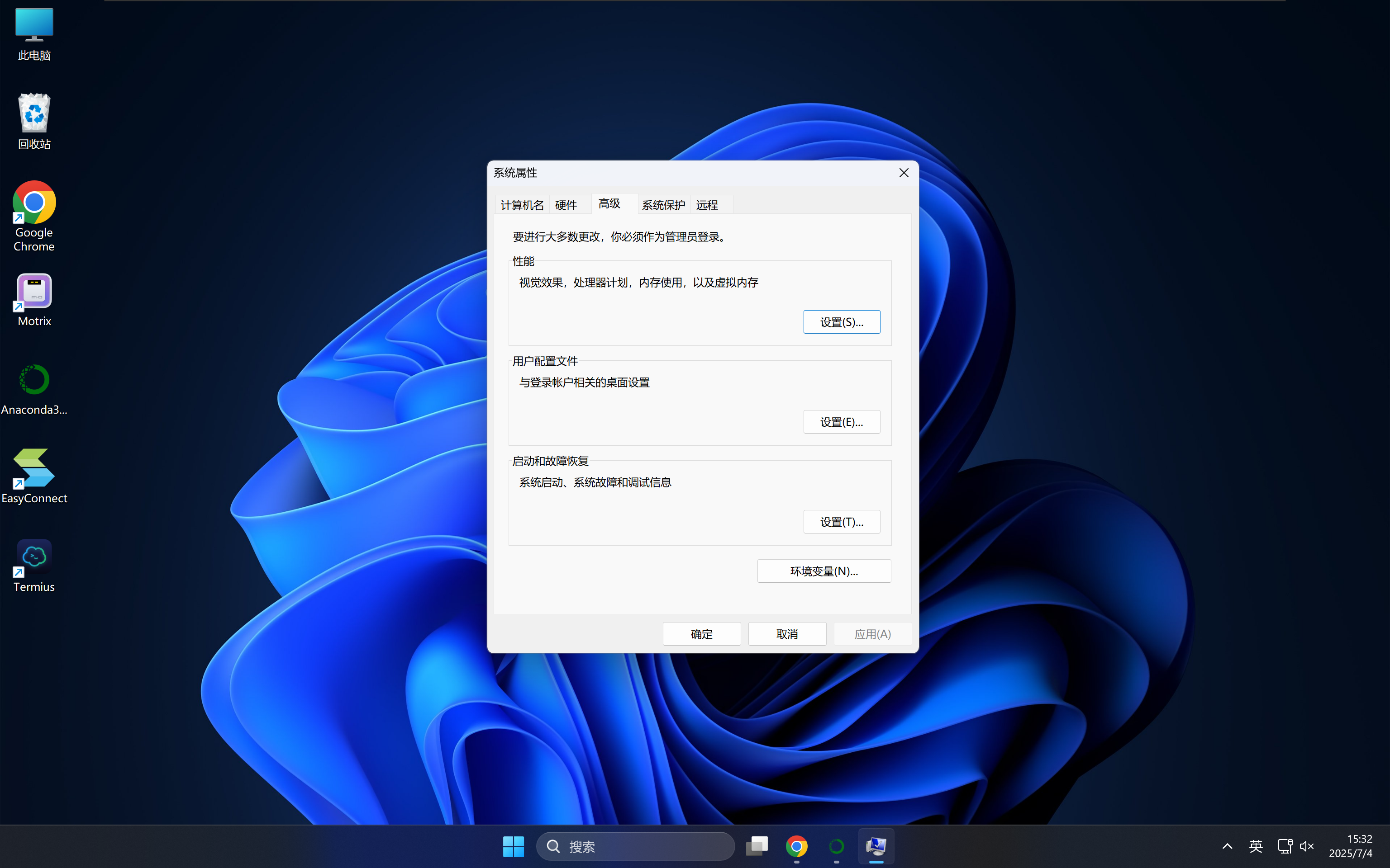 在完成安装后,我们需要配置Anaconda的环境变量。搜索栏搜索环境变量,并打开如图的系统属性页面。
