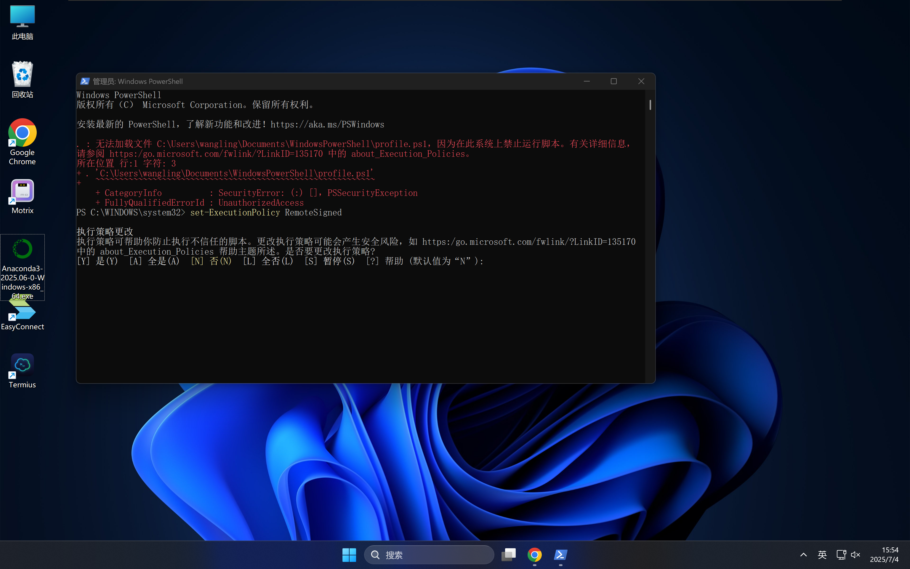 在执行完conda init 后重新打开PowerShell,可能会出现如下报错。
