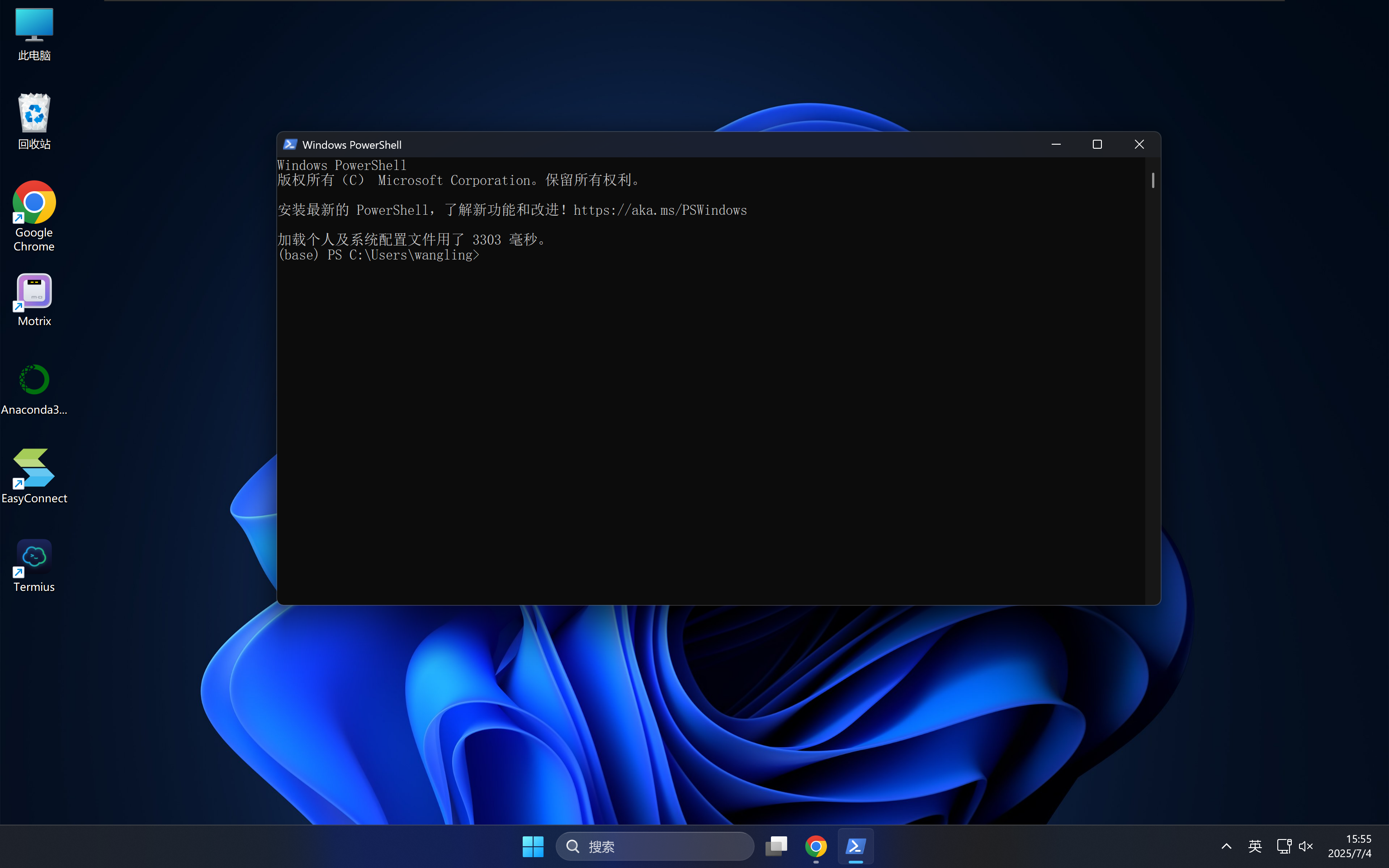 如果出现> For changes to take effect, close and re-open your current shell. < 则表示初始化成功。此时关闭PowerShell并重复操作重新打开,会在最前面出(base)字样。
