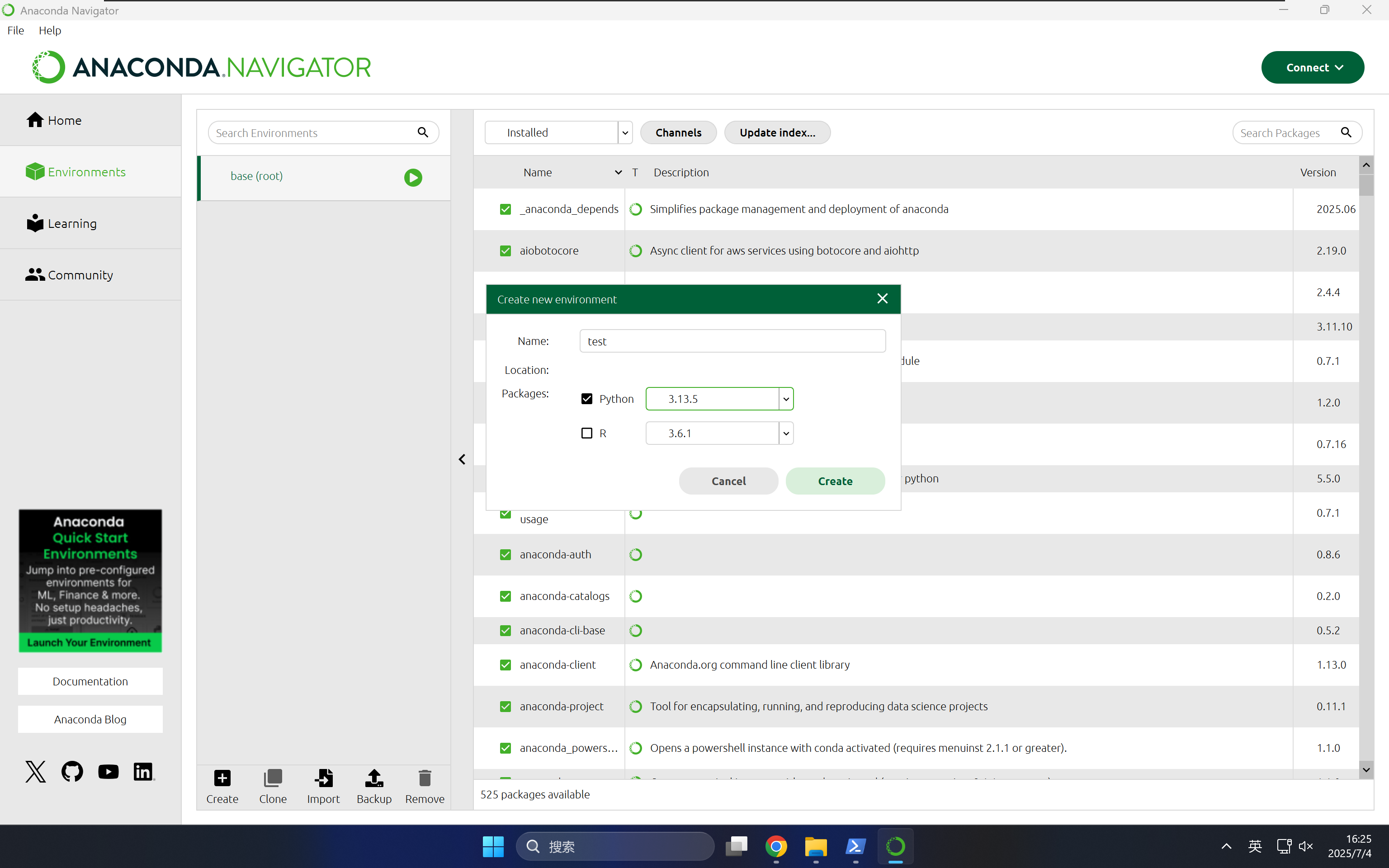 点击Environment 后中间会列出所有环境和每个环境所有的包。点击下方create就可以创建新的环境。