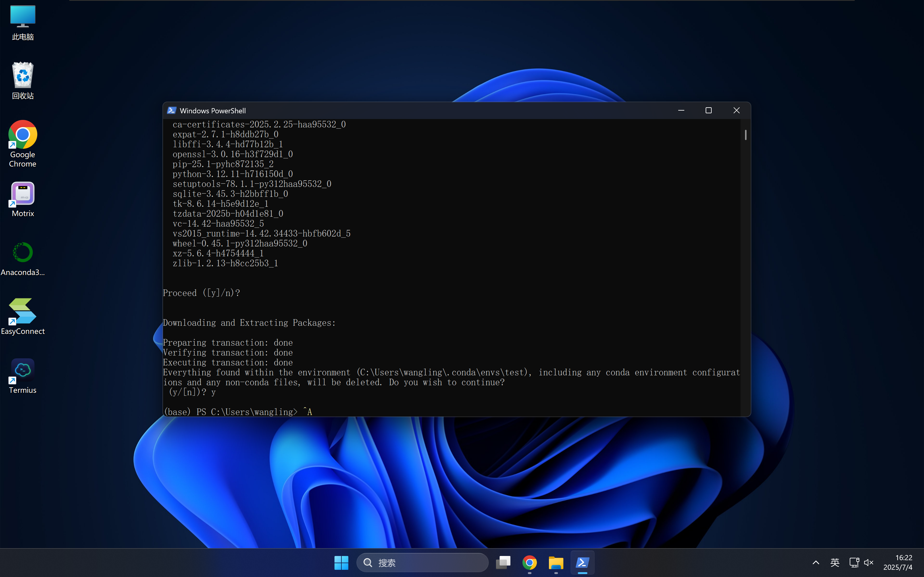 执行conda remove --name test --all ,注意需要输入两次Y和回车。如图就删除好了。